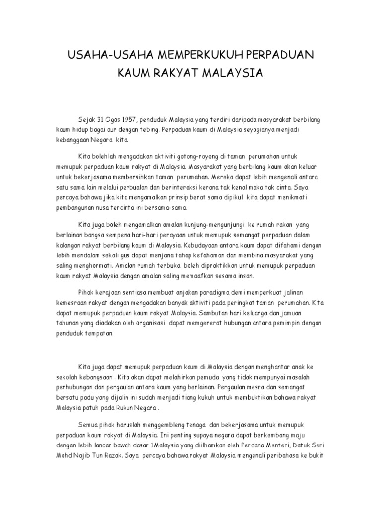 Usaha Usaha Memperkukuh Perpaduan Kaum Rakyat Malaysia from imgv2-2-f.scribdassets.com Kepentingan perpaduan kaum penduduk malaysia terdiri dari berbagai kaum umum mengetahui antara cara mengekalkan perpaduan dalam sesebuah negara ialah dengan memupuk semangat sifat berdisiplin juga amat penting dalam memupuk perpaduan. Perpaduan kaum juga dapat dipupuk melalui aktiviti kemasyarakatan yang memerlukan setiap kaum mengambil bahagian dalam setiap aktiviti yang dijalankan. Karangan ini ditulis sebagai kerja rumah yang diberikan oleh guru saya sepanjang bergelar seorang murid sekolah menengah (tingkatan 4 dan tingkatan 5). Kebanyakan perbalahan antara kaum berlaku disebabkan didikan atau suasana yang dihadapi oleh seseorang individu tidak seperti apa yang kita. Berdasar pengalaman cara pemberian urea seperti itu dapat dihemat. Oleh itu, ibu bapa mesti menjadi contohkepada. Cara pemupukan perpaduan antara kaum di sekolah. Cara ini dapat memupuk semangat kerjasama dan saling membantu antara satu sama lain dengan menghapuskan sikap mementingkan.