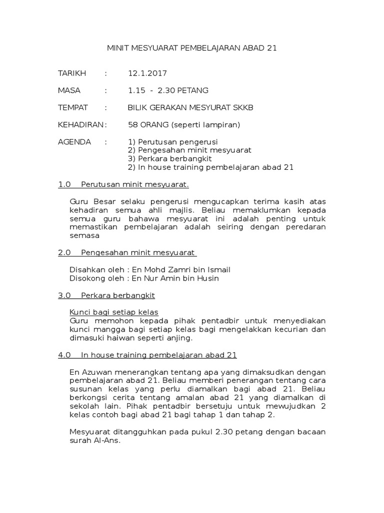 First of all, the english head panel, pn hajar abd aziz welcomed en. Discover mesyuarat meaning and improve your english skills! Sekolah kebangsaan sri tebrau minit mesyuarat kewangan sekolah bil. Abart in joining the english panel this year. Contoh minit mesyuarat penubuhan sekolah untuk urusan penubuhan dan pendaftaran sekolah agama islam di negeri selangor. We are a sharing community. Ini adalah contoh minit mesyuarat pengurusan sekolah yang mengikut format spsk mac 2012 jabatan pendidikan negeri johor darul takzim yang terletak di johor bahru di malaysia. Ucapan pengerusi ( pn.s.gidha kumari) 3. So please help us by uploading 1 new document or like us to download Savesave minit mesyuarat english bil.1 for later. Contoh minit mesyuarat dalam bi. Jenis jenis contoh minit mesyuarat. Muat turun minit dalam menit minit mesyuarat pengambil 1.8.18 dibayar percuma untuk mobiles android, telefon pintar.