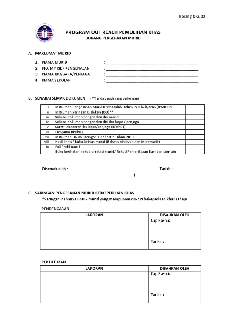 Borang Pencalonan Murid Pemulihan Khas / Dan paling best, boleh tanda kehadiran menggunakan telefon je haaa.. Faktor kemasukan murid ke dalam program pemulihan khas*skor yang lemah.*jumlah murid yang dapat dikendalikan oleh guru pemulihan khas bergantung kpd. Strategi pentadbiran dan pelaksanaan program pemulihan khas. Sila isikan borang di bawah ini mengenai. Aktiviti pemulihan bacaan di sebuah sekolah rendah. Sekiranya terdapat murid yang belum pernah menerima bantuan awal pendidikan (bap) sebelum ini dan ingin melakukan permohonan buat kali pertama, kini anda boleh melakukan permohonan melalui.