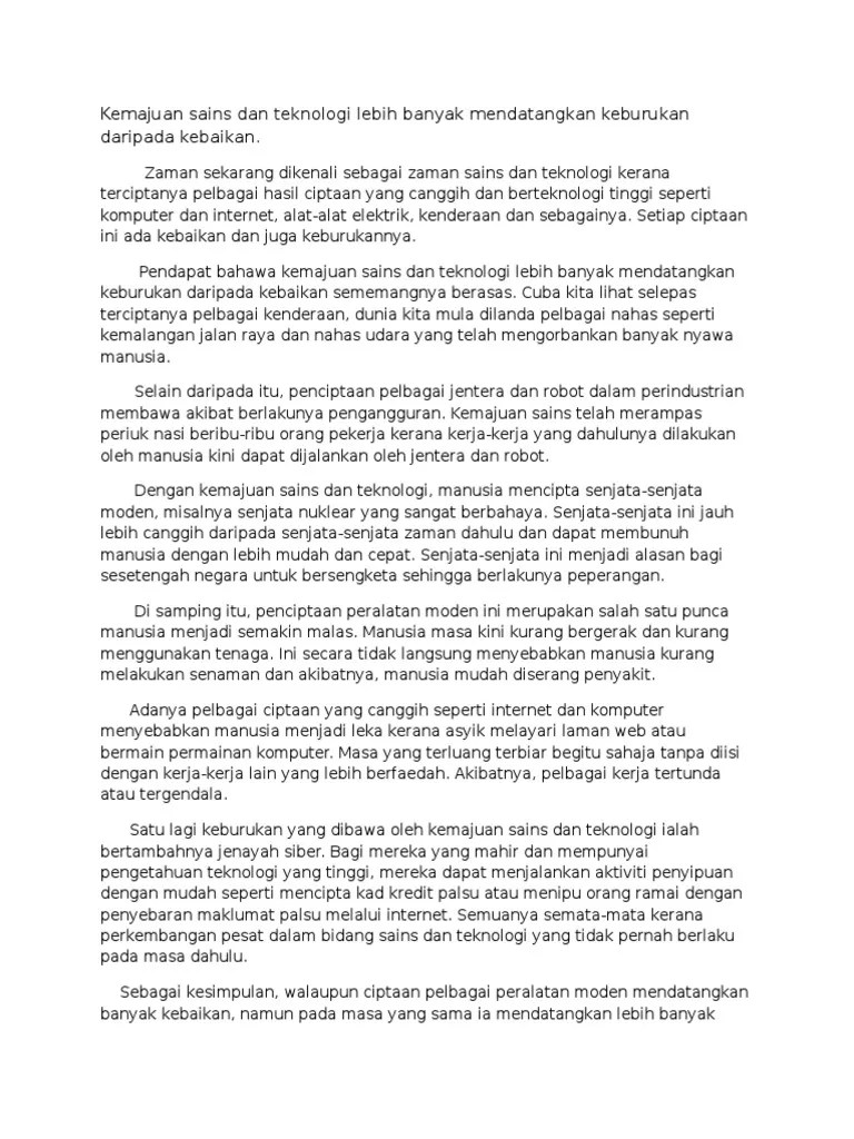 Manfaat sains dan teknologi kepada kehidupan manusia. For personal bm tuition through whatsapp, please whatsapp cikgu suguz 0196626057 or visit www.cikgusuguz.com.my. Karangan kebaikan perkembangan sains dan teknologi. Teknologi hijau adalah aplikasi sains alam sekitar untuk memulihara sumber dan alam semulajadi bagi menangani impak negatif aktiviti. Jika diterapkan dengan benar sains dan teknologi akan meningkatkan efektifitas dan efisiensi suatu proses thus meningkatkan produktivitas umat manusia yang pada akhirnya meningkatkan taraf hidup.