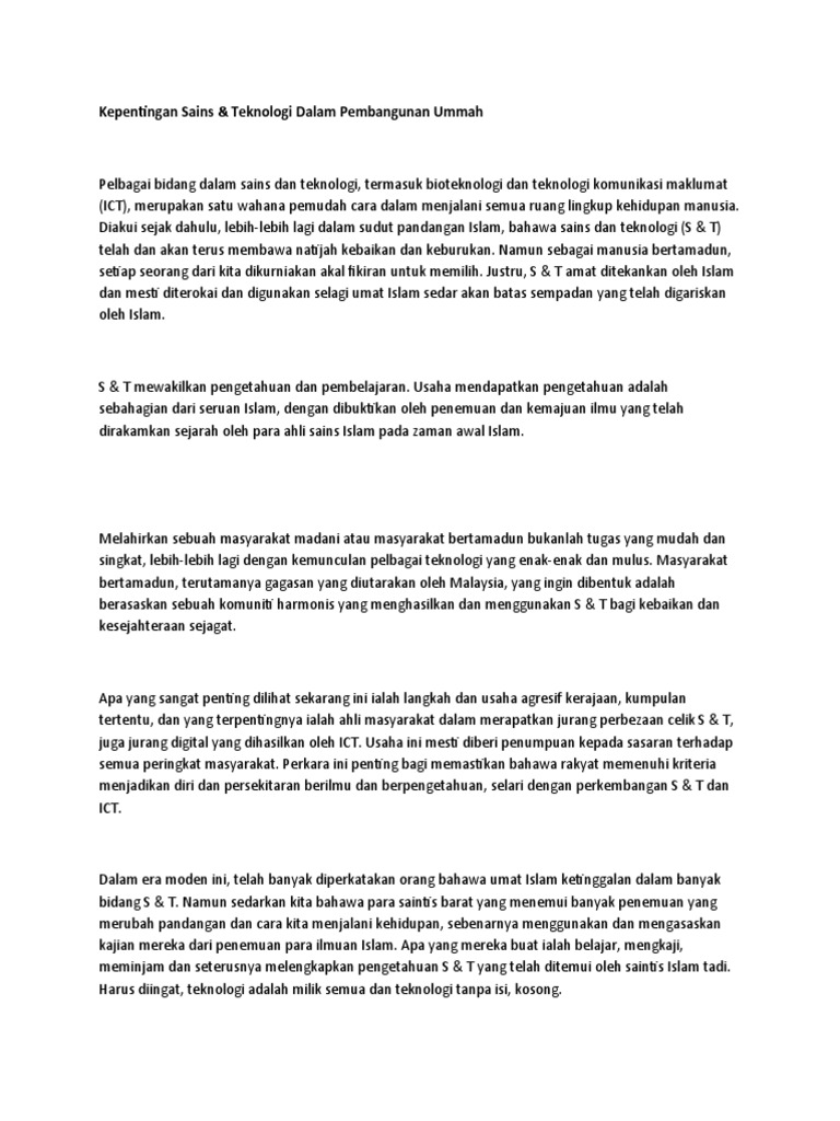 Menyebabkan umat islam malas di mana. Tidak ada negara dan bisnis apapun yang dapat memenuhi semua jenis teknologi yang dampak negatif dari kehadiran media sosial adalah memberikan jarak kepada orang di sekitar keberadaan teknologi sekarang tidak dapat dilepaskan dengan kepentingan sosial politik yang melingkupinya. Manusia mempunyai naluri dan keinginan untuk mempertingkatkan taraf hidup. Kebaikan dan keburukan teknologi kepada masyarakat. Berikan pendapat anda tentang kepentingan sektor pertanian kepada negara. Peranan sains dan teknologi islam. Kepentingan pelaburan asing kepada negara pembangunan infrastruktur dalam negara membawa masuk teknologi Pembinaan dan pengawasan, serta tanggung jawab dan peran masyarakat dalam penyelenggaraan ilmu pengetahuan dan teknologi guna menjamin kepentingan masyarakat, bangsa, dan negara serta keseimbangan tata kehidupan manusia dengan kelestarian fungsi lingkungan Dihasilkan akan menentukan apakah sistem akan terus beroperasi atau tidak. Kepentingan sains dalam kehidupan seharian. Kepentingan peranan sains dan teknologi islam kesan pengabaian sains dan teknologi kepada umat kepentingan. For personal bm tuition through whatsapp, please whatsapp cikgu suguz 0196626057 or visit www.cikgusuguz.com.my. Dampak perkembangan sains dan teknologi terhadap masyarakat indonesia sangatlah bermanfaat bagi kelangsungan hidup dan memajukan negara indonesia ini.